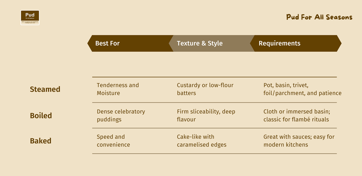 Start with your texture target. If you want a plush sponge that slices cleanly yet melts under hot custard, go steamed. When you crave a compact, intensely flavoured sphere with a firm bite (and a showy flambé), go boiled. If you love a lightly caramelised top with a cake-like crumb, bake it. Then match your kitchen reality—stockpot and space for a trivet? Go steam/boil. Only an oven on a weeknight? Bake and don’t look back.